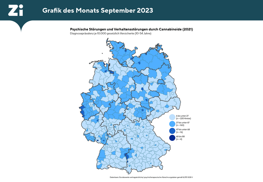 2021 ist in Deutschland bei insgesamt 108.313 gesetzlich Versicherten im Alter von 10 bis 54 Jahren eine psychische Störung bzw. Verhaltensstörung durch Cannabinoide dokumentiert worden. Bezogen auf den Bevölkerungsanteil aller Versicherten der Gesetzlichen Krankenversicherung (GKV) in diesem Alterssegment (37.530.512) entspricht das einer bundesweiten Diagnoseprävalenz von 29 Fällen je 10.000 GKV-Versicherte. Dabei zeigen sich zwischen Jugendlichen und Erwachsenen deutliche Unterschiede in der Diagnoseprävalenz (10 bis 17 Jahre: 4 je 10.000; 18 bis 54 Jahre: 32 je 10.000). Regional auf Ebene der Landkreise und kreisfreien Städte betrachtet, ist anhand der Abrechnungsdaten ein deutliches Nord-Süd-Gefälle zu erkennen.